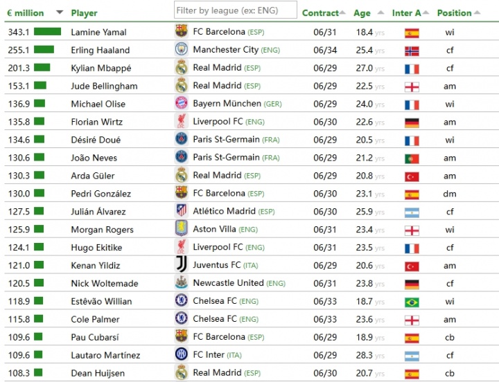 01月07日讯 CIES足球天文台发布了最新报告,根据CIES的统计模型,更新了转会价值前100的球员。亚马尔以3.431亿欧位列第一,哈兰德和姆巴佩排名第二、第三。五大联赛之外转会价值最高的是罗克8500万欧。