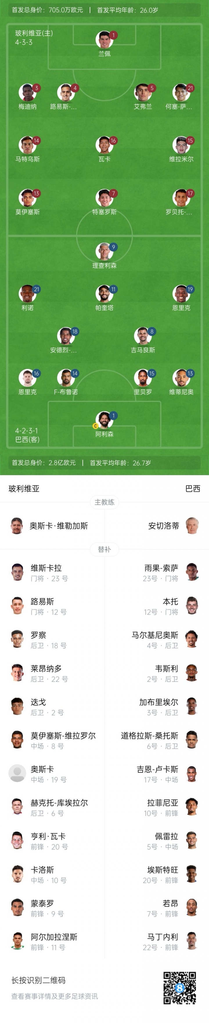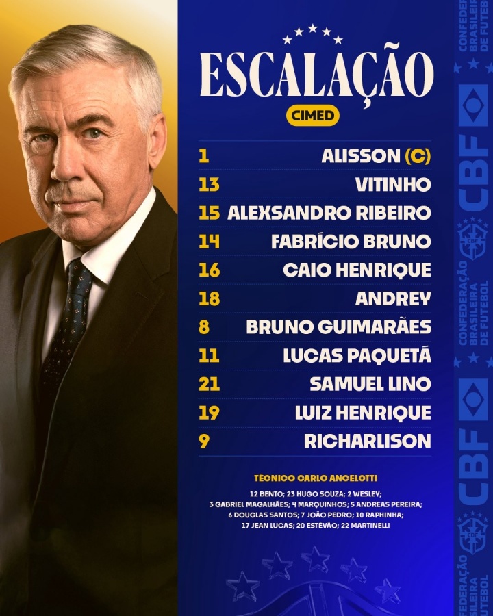 巴西队替补:12-本托、23-雨果-索萨、2-韦斯利、3-加布里埃尔、4-马尔基尼奥斯、5-佩雷拉、6-道格拉斯-桑托斯、7-若昂-佩德罗、10-拉菲尼亚、17-吉恩-卢卡斯、20-埃斯特旺、22-马丁内利