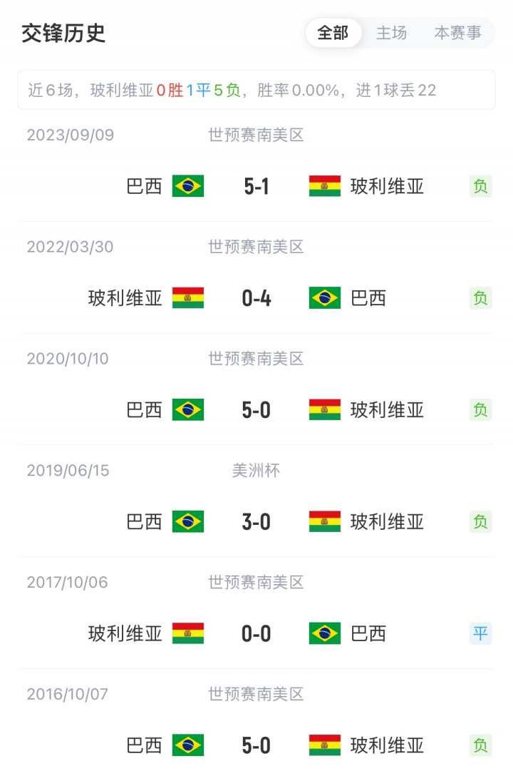 巴西队在世预赛近三轮保持不败,而玻利维亚上一轮客场0-3负于哥伦比亚。在正式比赛中,巴西对玻利维亚已连续六场保持不败,战绩为五胜一平。